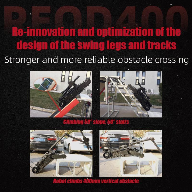 ربات REOD400 EOD یک راه حل پیشرفته برای دفع سلاح های انفجاری (EOD) در محیط های پرخطر است. با طراحی منحصر به فرد "دو گرفتگی" ، می تواند به طور همزمان وظایف مختلفی را انجام دهد ،که باعث می شود آن را بسیار کارآمد برای عملیات مانند مبارزه با تروریسم شهری، ایمنی عمومی، کمک به زلزله و دفع بمب. این ربات جمع و جور و سبک وزن است، با ابعاد ≤830mm × 600mm × 460mm (به طور کامل ذخیره شده) و وزن ≤37kg.حداکثر سرعت ≥1.8m/s با 5 دنده و یک درایو متغیر مداوم، فاصله مانع ≥300mm و قابلیت ارتفاع و توانایی صعود پله تا 45°تضمین مانور پذیری و سازگاری عالی در زمین های مختلف.