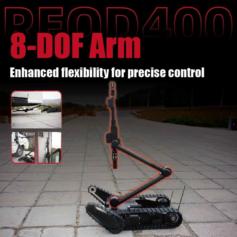 بازوی رباتیک REOD400 دارای یک طراحی یکپارچه 8 درجه آزادی است، که قابلیت دسترسی فضایی قوی را فراهم می کند.این طراحی به بازوی رباتیک اجازه می دهد تا نه تنها کارهای معمولی تخریب بمب را انجام دهد بلکه همچنین کارهایی را که ربات های معمولی تخریب بمب با 5 یا 6 درجه آزادی نمی توانند انجام دهند، مانند گرفتن اشیاء در محیط های بالا، پایین، عمیق یا سطح میز، و همچنین انجام شناسایی چند زاویه ای در محیط های بالا، پایین و عمیق.